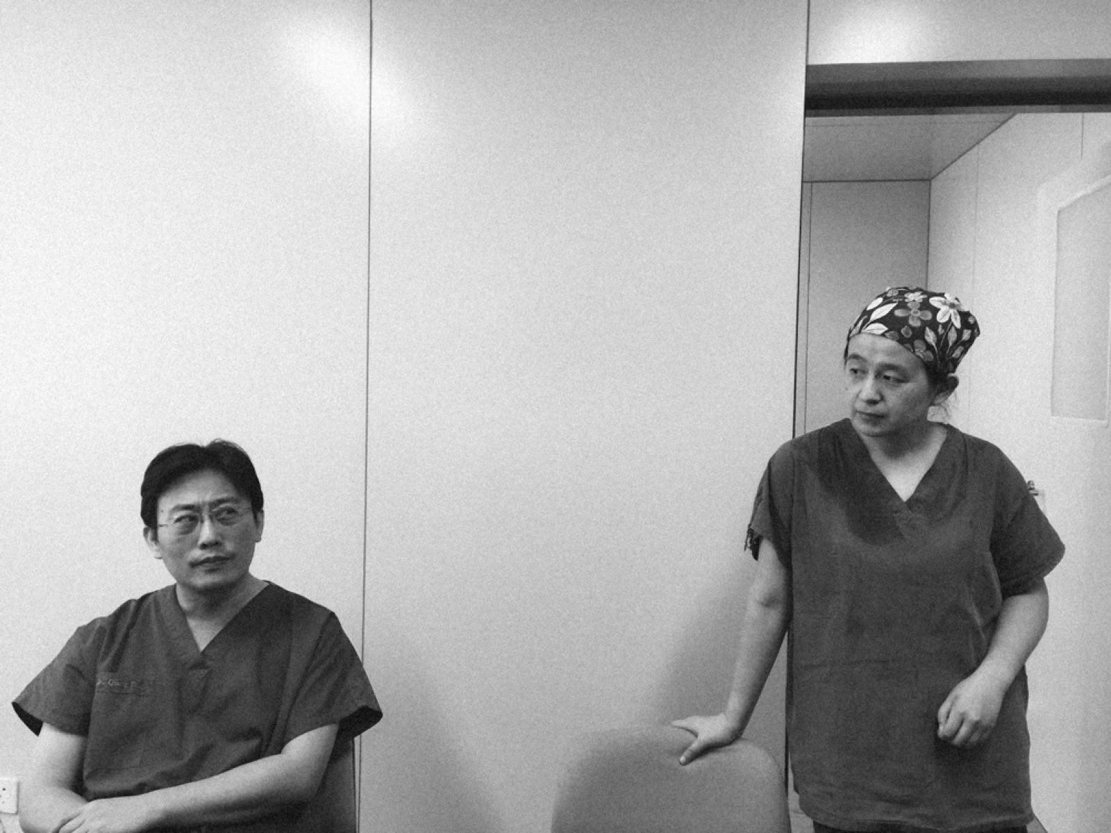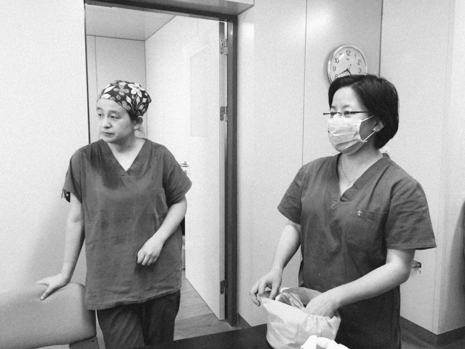 王硕和姚瑾秋刚从手术台下来,都还戴着医用口罩。姚瑾秋脸蛋瘦削,戴着黑底紫花的手术帽,铅衣沉重不透气,底下棉质的绿色手术衣都被汗水浸透了。