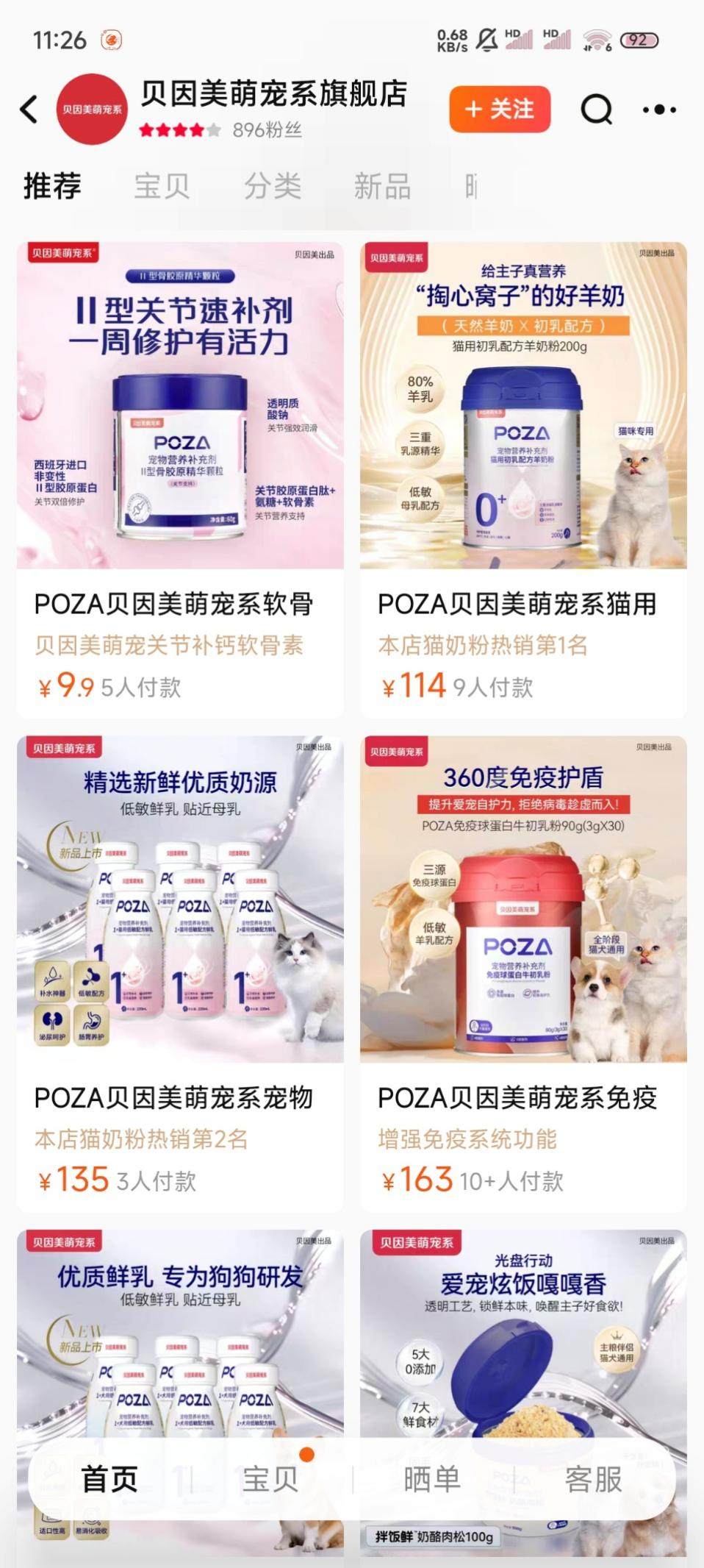 例如贝因美推出了POZA贝因美萌宠犬用和猫用初乳羊奶粉和宠物鲜牛乳等产品,目前在淘宝萌宠系旗舰店中,单一产品仅有数十人购买。