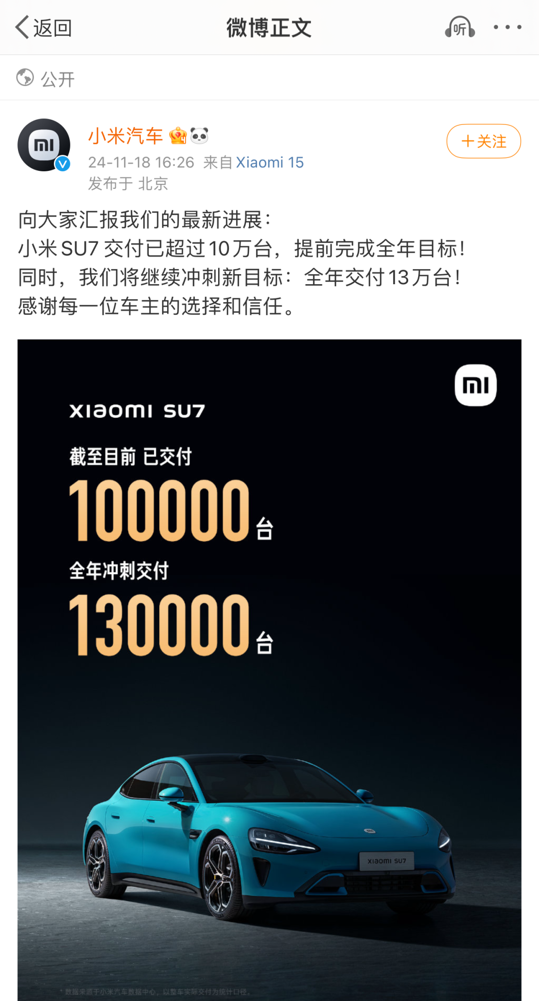 雷军还带来喜讯,称小米SU7交付量成功跨越10万辆大关。小米不仅提前将全年目标收入囊中,还雄心勃勃剑指全年13万辆的新高度。