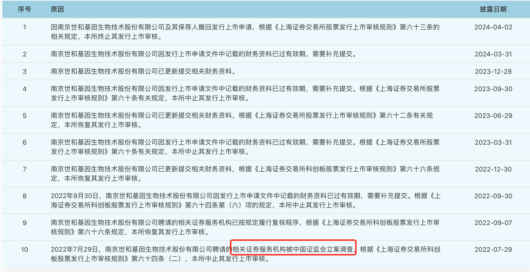 有个插曲是,此前在世和基因刚获得受理不久,就因聘请的相关证券服务机构被中国证监会立案调查,在2022年7月29日中止了IPO。