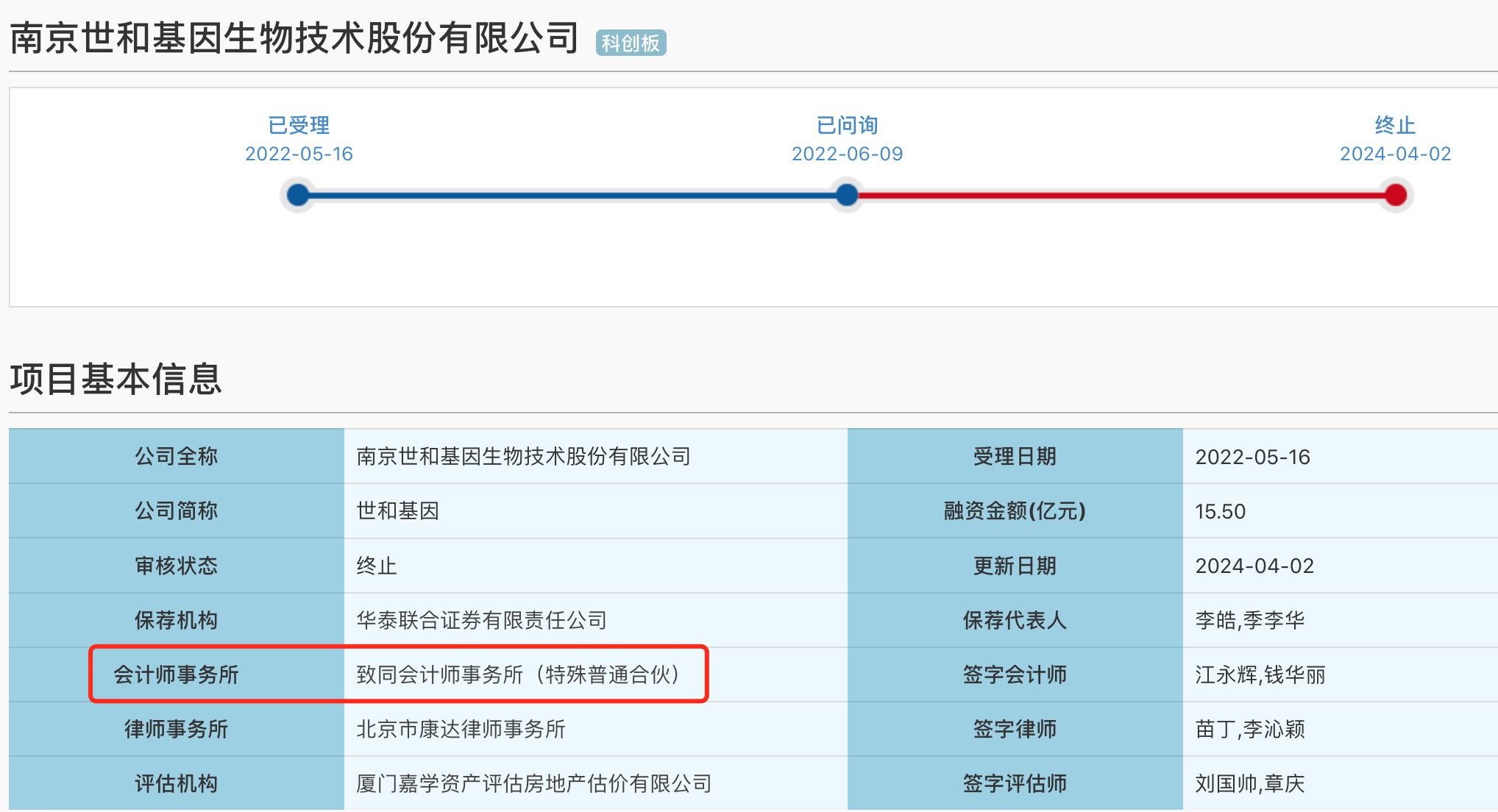 公开信息显示,世和基因2022年5月16日首次公开发行股票并在科创板上市获得受理,约2年时间的排队后,公司以拟调整战略规划为由,于2024年3月主动撤回了发行上市申请,2024年4月2日,上交所终止了对世和基因发行上市的审核。