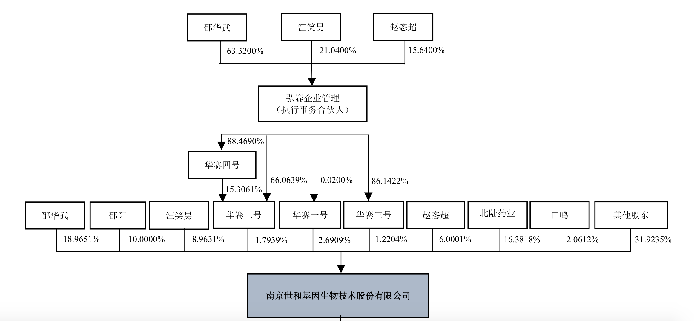资料显示,世和基因控股股东和实际控制人为邵华武、邵阳、汪笑男,其中,邵华武与邵阳为父子关系,邵阳与汪笑男为夫妻关系。根据2022年5月16日的申报稿,邵华武、邵阳、汪笑男直接及间接合计持有发行人40.6080%的股份,合计控制发行人43.6334%的股份表决权。