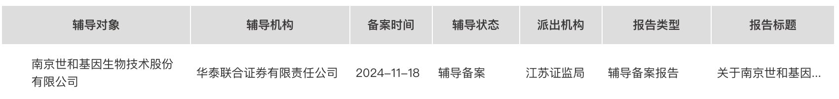 之后的2024年9月6日,世和基因和华泰联合再签首次公开发行股票辅导协议,并向证监会江苏监管局申请辅导备案,相关备案信息于11月18日披露。