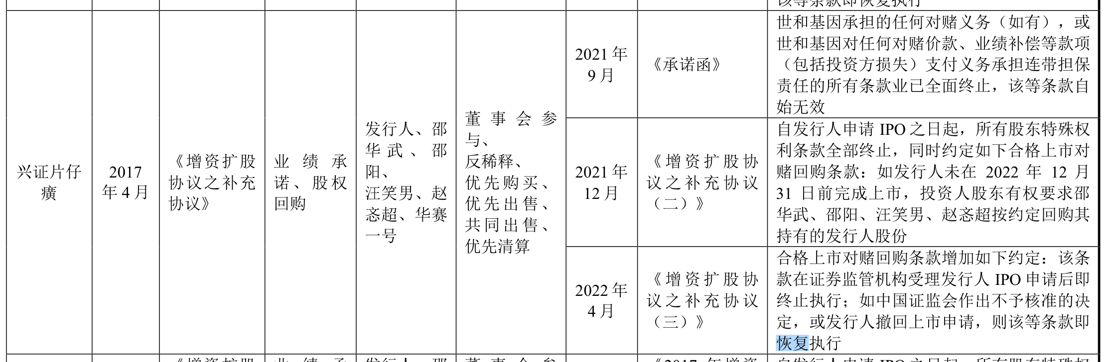 由此看来,在2024年4月2日上交所终止了对世和基因发行上市的审核后,部分对赌应该是恢复了,且触发恢复的还不少。或许,世和基因急急忙忙再度启动IPO,也与对赌有关。