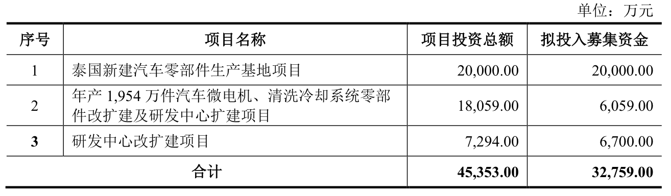 至于恒帅股份,根据10月16日的修订版本,公司计划融资3.2759亿元,投入3项目:泰国新建汽车零部件生产基地项目(2亿元);年产1954万件汽车微电机、清洗冷却系统零部件改扩建及研发中心扩建项目(6059万元)、研发中心改扩建项目(6700万元)。
