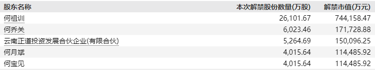 此次解禁的股东共有五位,分别为实控人“何氏家族”——何祖训、何乔关、何月斌和何宝见四人及一致行动人云南正道投资发展合伙企业(有限合伙)。原始股东持股成本通常远低于发行价,不过实控人家族暂未披露减持计划,且公司正处于股份回购期,此次解禁筹码集中,解禁压力不大。