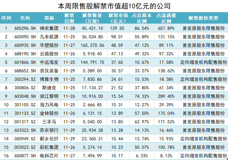 本周解禁市值超过10亿元的公司有16家,神农集团(605296.SH)是唯一一家解禁规模超过100亿元的公司,九丰能源(605090.SH)次之,解禁市值近100亿元。华塑股份(600935.SH)、云路股份(688190.SH)两家公司解禁市值超过40亿元。