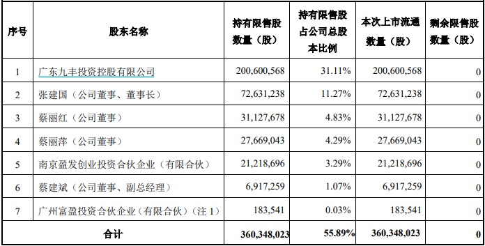 此次解禁股东共7位,分别为九丰能源实控人张建国、蔡丽红,实控人一致行动人蔡丽萍、葵建斌,控股股东广东九丰投资控股有限公司,还有实控人控制的企业南京盈发创业投资合伙企业(有限合伙)。