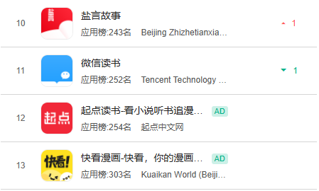 现如今,快看漫画在各大应用渠道的下载、收入、热度排行榜TOP250中几乎消失。在“图书”分类中,快看更是经常性的低于微信读书和盐言故事,要知道,微信读书的月活疫情后一直维持在2000万的级别(2023年三季度末为2179.1万人 ),而快看漫画官方公布的月活仍停留在2021年8月的“接近5000万”后再未披露,根据Questmobile的数据显示,去年10月快看漫画月活为1631万人。