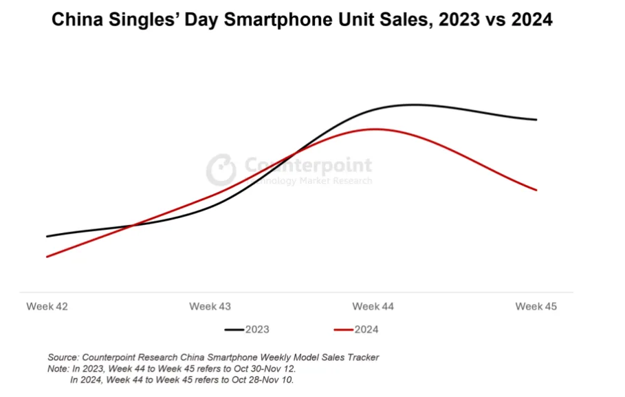 不过需要注意的是,上述亮眼的数据仅统计自11月10日晚8点-24点,整体而言,大促期间,荣耀手机的市场表现并不亮眼。Counterpoint Research披露的数据显示,2024年双十一期间,“荣耀手机整体销量在激烈的市场竞争中同比下跌15%”,远高于同期中国整体智能手机销量9%的跌幅。