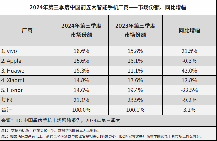 需要注意的是,IDC数据显示,2024年以来,中国智能手机行业已开始稳步复苏,Q1-Q3分别同比增长6.5%、9.2%以及3.2%。在此背景下,vivo、华为、小米等手机厂商的出货量均同比正增长。