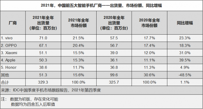 IDC披露的中国智能手机市场报道显示,2021年,荣耀手机出货量3860万台,市占率为11.7%,重返TOP 5榜单;2022年,荣耀手机出货量同比激增34.4%,是当年中国手机市场TOP 5榜单中,唯一一家出货量正增长的品牌。