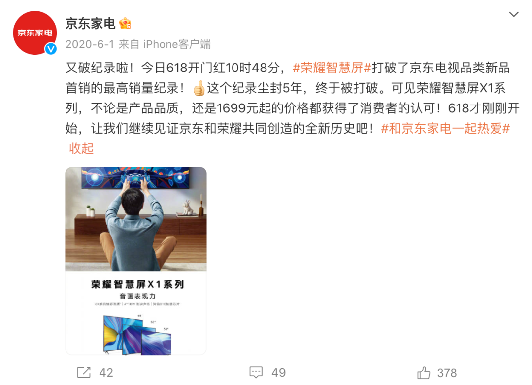 以电视业务为例,为了营造差异化,荣耀推出智慧屏产品之初,喊出了无广告的宣传口号,并主打高性价比。此举确实帮助荣耀智慧屏打开市场。2020年618,荣耀智慧屏打破了京东电视类新品首销最高销量纪录,该纪录已被尘封五年。