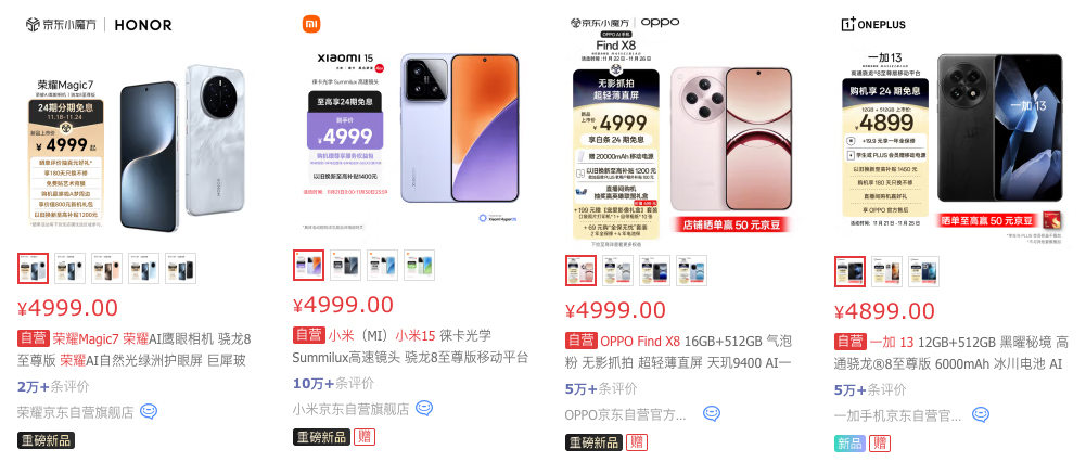 然而颇为反常的是,极具话题性的荣耀Magic7并未成为爆款。截至2024年11月23日,在京东平台,荣耀Magic7的评论量为2万+。对比而言,与荣耀Magic7同期发布的小米15、OPPO Find X8、一加 13等旗舰手机的京东评论量分别为10万+、5万+、5万+。