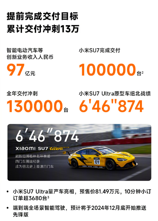 为了摆脱下行压力,目前诸多智能手机厂商都开始加码IoT、智能汽车等“新故事”。以小米为例,截至2024年11月18日,小米SU7交付已超10万台,提前完成全年目标。小米将冲刺全年交付13万台小米 SU7 的新目标。2024年Q3,小米智能电动汽车等创新业务分部营收97亿元,营收占比10.49%,已成为公司的“第二条曲线”。