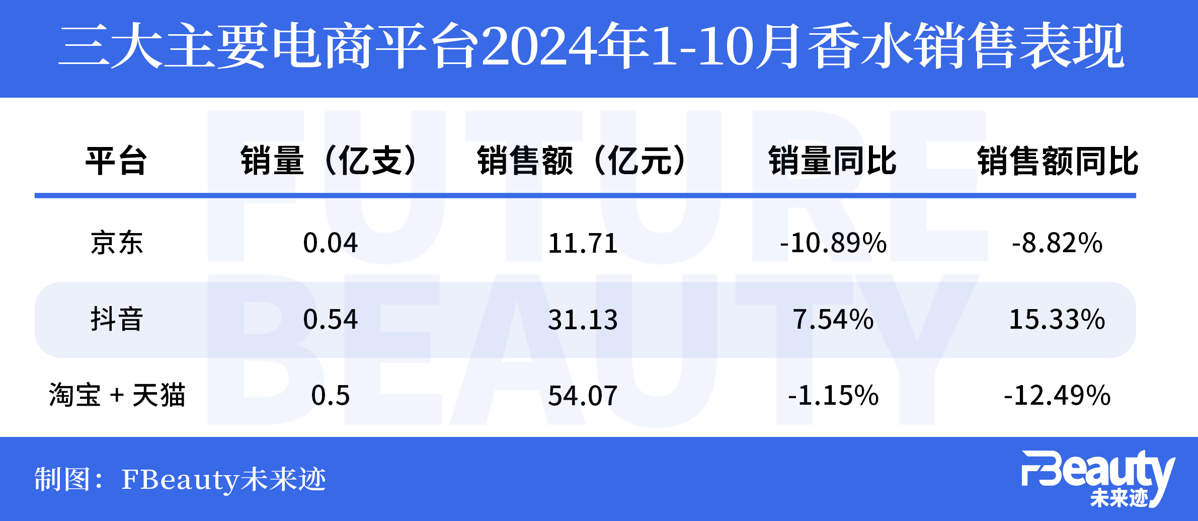 数据显示,2024年1-10月三大主要电商平台共实现香水销售96.92亿元,销量同比增加2.65%,但销售额同比下滑4.64%。分平台来看,香水除了在抖音实现了增长之外,在淘天和京东均正在面临销量和销售额同时下滑的局面。