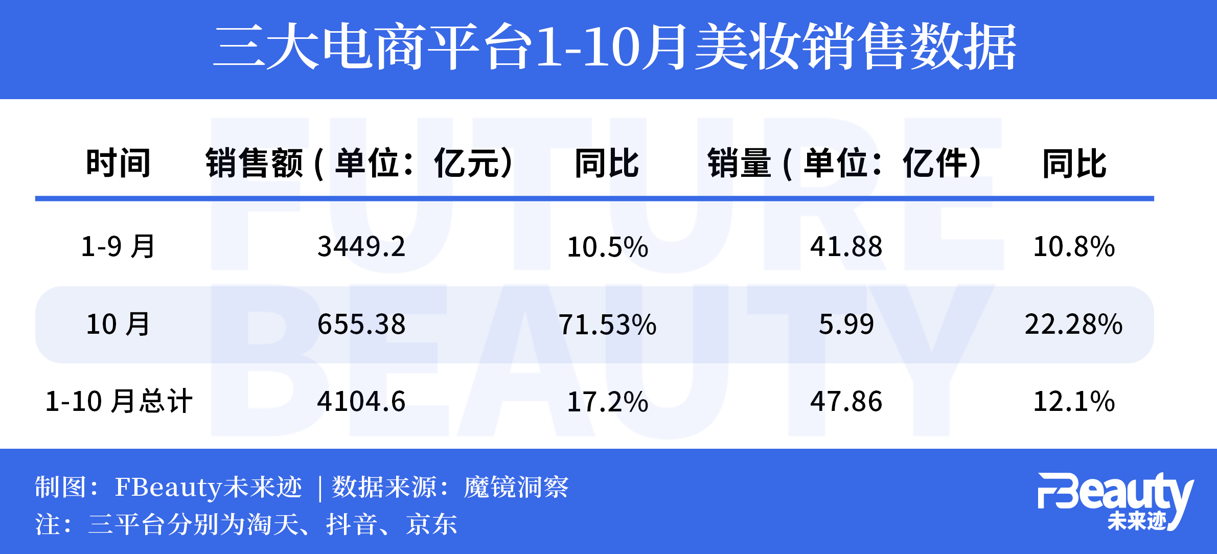 但值得注意的是,《FBeauty未来迹》发现从数据上来看,淘天+抖音的占比已经达到80.77%,并且就淘天、抖音、京东的销售情况来看,今年1-10月三大主要电商平台的美妆品牌总计实现交易额4104.6亿元,同比增长了17.2%;即使排除10月份的影响,1-9月同样有10.5%的同比增幅。