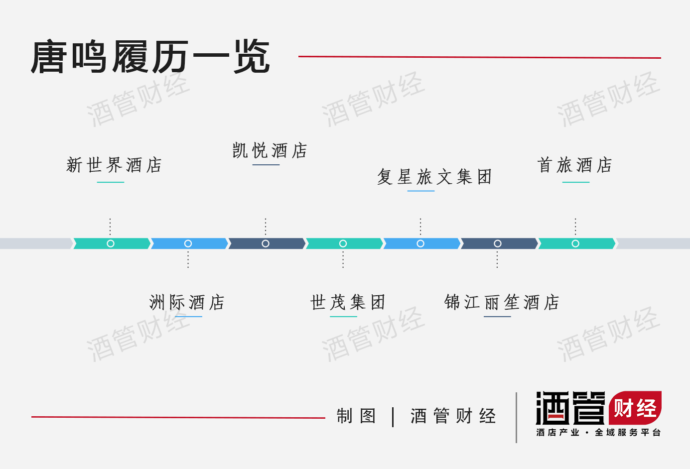 在2022年离开世茂后,唐鸣先后任职复星旅文集团、锦江丽笙酒店,直至当下加入首旅酒店,来到了他职业生涯的第七站。