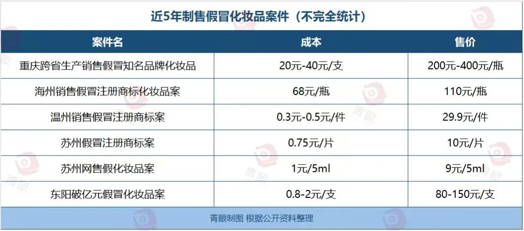 典型如,今年7月,重庆南岸警方曾对外公布,一跨省制售假冒化妆品的犯罪团伙自2022年以来,以每支(盒)20元至40元不等的价格购进假冒知名品牌化妆品,售价达200元至400元,成本与售价间相差10-20倍。