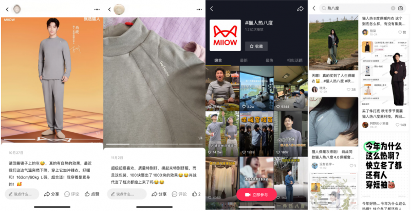 在抖音平台,#猫人热八度的抖音话题目前已突破1.2亿次播放。在小红书,猫人热八度系列被年轻人称之为“买到了人生保暖内衣”、“秋冬战袍”,既可以做打底也能外穿的小众半高领暖衣,已经是都市潮人们出门必不可少的“保暖搭子”。