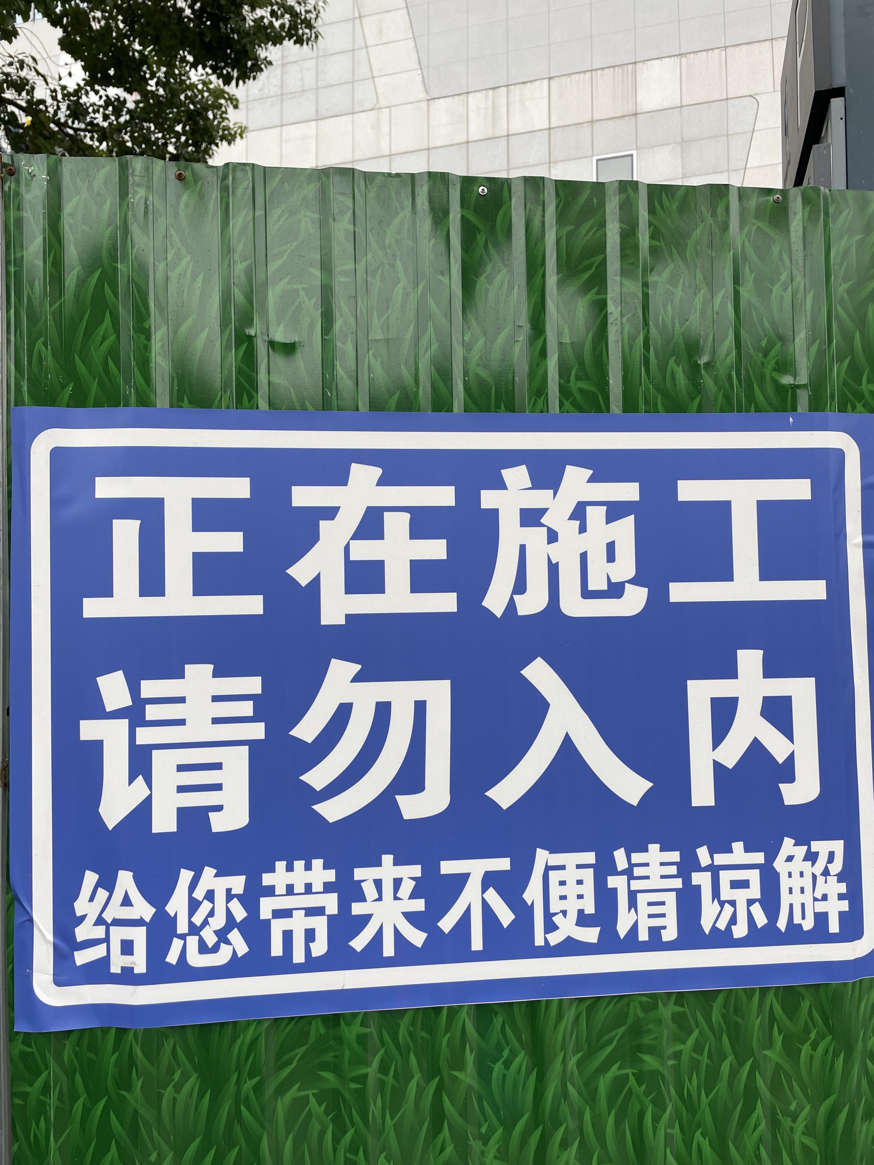 外部,合肥银泰in77正在建设和改造中,新地中心办公楼左侧和右侧全都围起来了。从外面看不到里面建设的实况,只能听到施工的声音,围挡上面写着正在施工、请勿入内的字样。