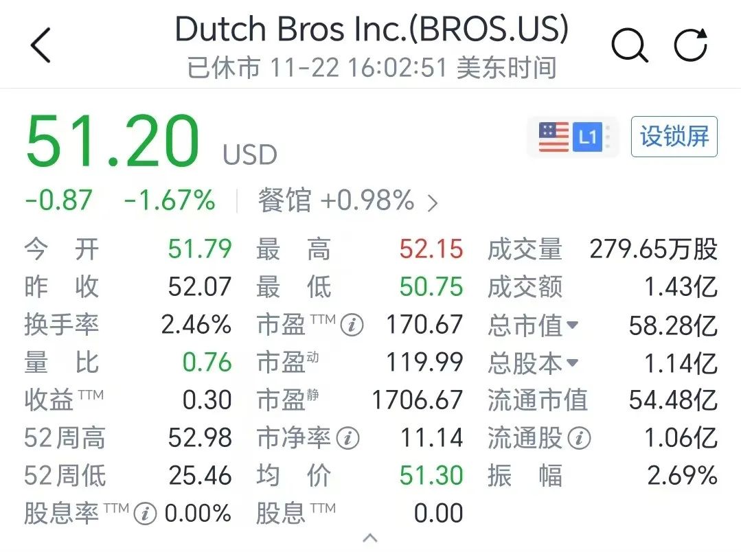 即便按照未来的动态市盈率计算(考虑增长因素向后估算盈利),三季报后的Dutch Bros的PE仍然超过100倍,而瑞幸的动态市盈率在业绩大涨和股价大跌以后只剩下10倍左右——