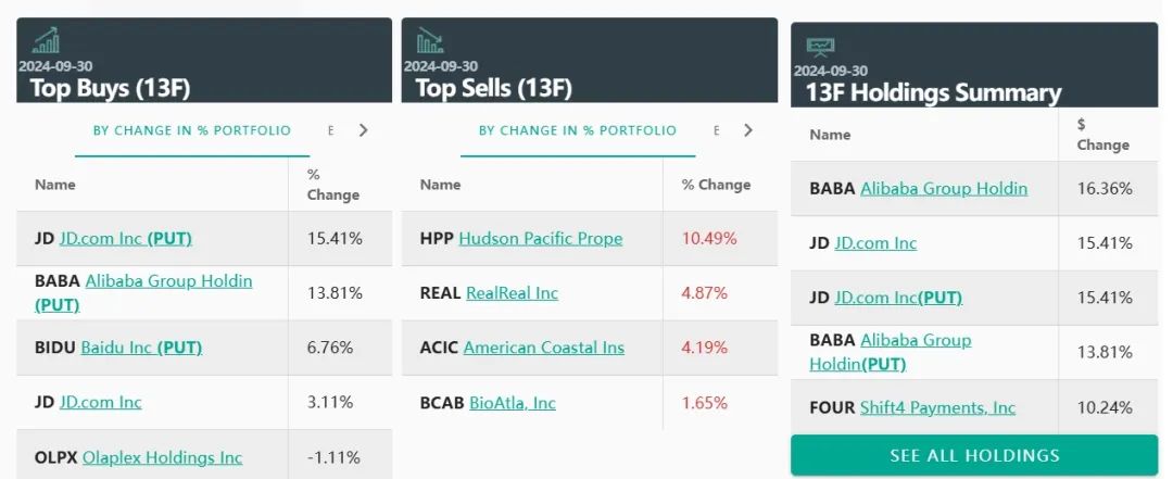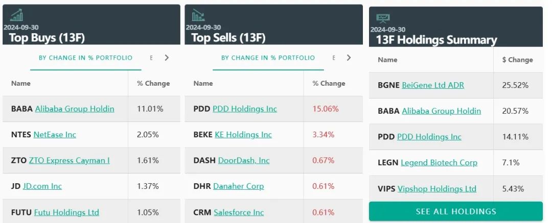也有很多人不认同这些想象空间。与三季度报一同披露的,还有那些著名投资者人的持仓。他们之中的一部分,正在大幅度地减持美股,并加大对中概股的投资力度。