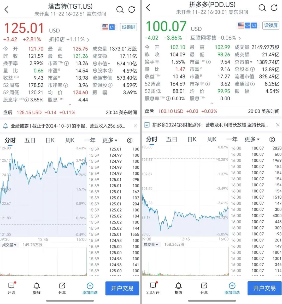 比如折扣商店塔吉特。日前,这家零售商发布了三季度财报,业绩不及预期,净利润出现下滑,股价一日内暴跌20%。但即便如此,其市盈率仍然超过12倍,高于拼多多。美国连锁超市克鲁格三季度利润出现小幅度下滑,但仍然有15倍的市盈率。