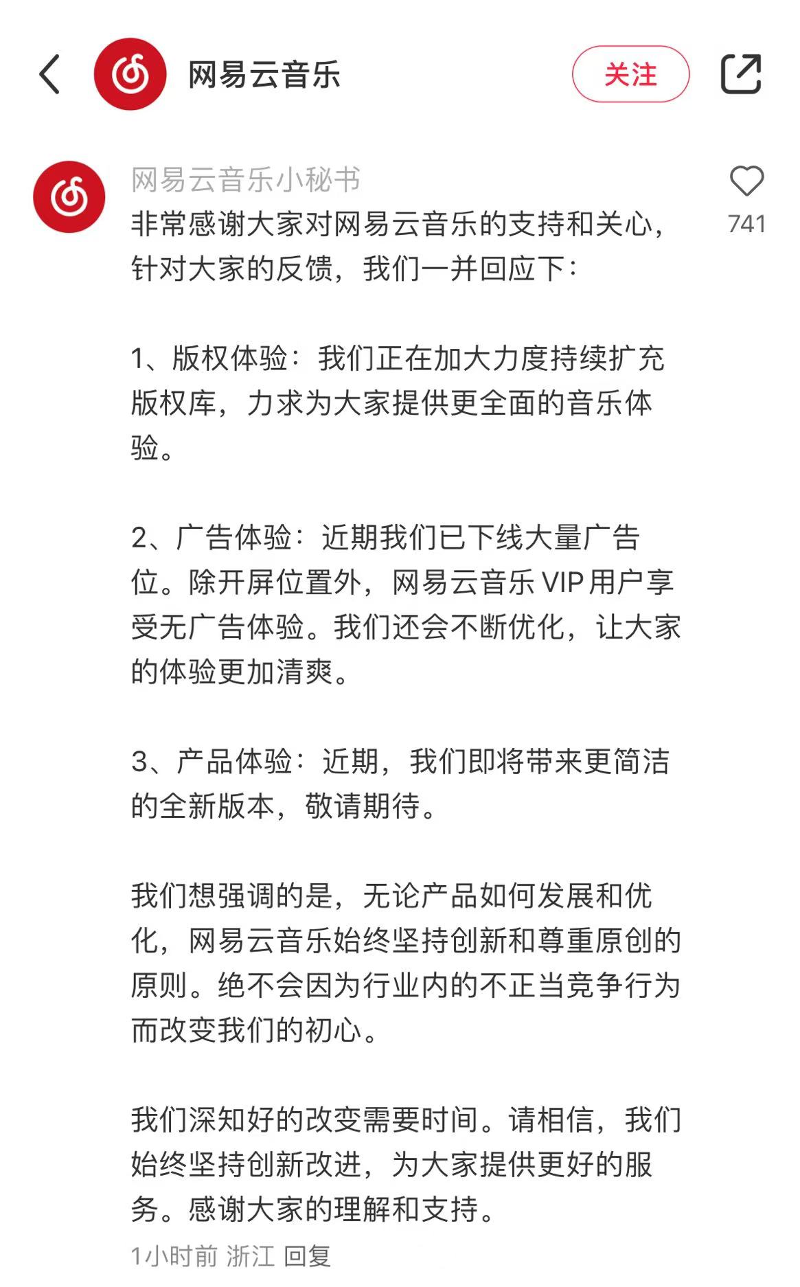 11月25日,针对用户关注的版权、广告及产品体验等问题,网易云音乐在社交平台回应称,近期已下线大量广告位,正在加大力度持续扩充版权库,并表示近期将推出更简洁的全新版本。