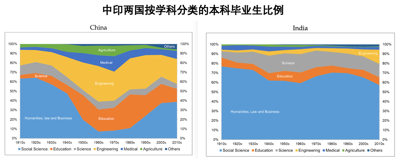 两国教育路径中更大的不同在于学科选择的差异上。在中国的高等教育体系中,工程学、计算机科学、材料科学和相关技术领域长期占据主导地位,据统计,高等学校中近半学生主修这类专业;相比之下,文学、历史、哲学等文科类专业在中国高等教育中相对受到了忽视,而近年来这种分化尤为凸显。但在印度,社会科学,包括经济学、法律和政治学,以及商科,如工商管理、会计学,在高等教育中占据显著比例,选择这类文科的学生占比达到了60%。