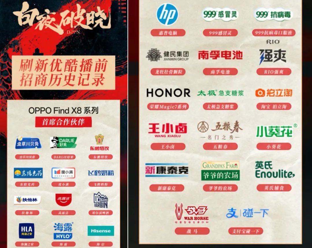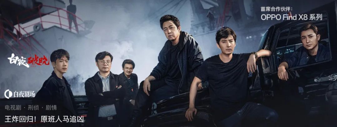 肉眼可见的,《白夜破晓》又为剧集广告开拓出很多新玩法,比如优酷APP首页封图右上角很抢眼的「首席合作伙伴:OPPO FindX8系列」字样,比如播前剧方就官宣了30+合作品牌刷新了优酷播前招商历史记录,比如第二季热播还带动了前季《白夜追凶》被追投单集5广……