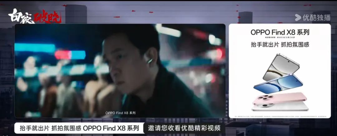 此外,另一个值得关注的剧集投放新现象,是如今剧方给冠名商提供了越来越多元、向综艺冠名看齐的综合营销服务。比如这次的OPPO Find X8系列之于《白夜破晓》——