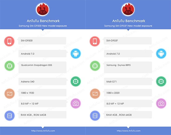 根据安兔兔资料显示,这次亮相安兔兔平台的S8分别有5款,从型号来看分别是搭载了骁龙835的SM-G9500/SM-G9550和SM-G955U(国行版Glaxy S8/S8+,国际版Galaxy S8+)以及搭载了Exynos 8895的SM-G950F/SM-G955F(国际版Glaxy S8/S8+)。