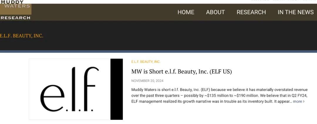 近日,浑水公司在官网发布做空报告,称“早在2024财年第二季度(2023年第三季度),elf Beauty的管理层就已意识到其即将陷入增长困境,便开始虚报收入和利润,并在过去三个季度中虚报了1.35 亿美元至约 1.9 亿美元(约合人民币9.78~13.77亿元)的业绩。”