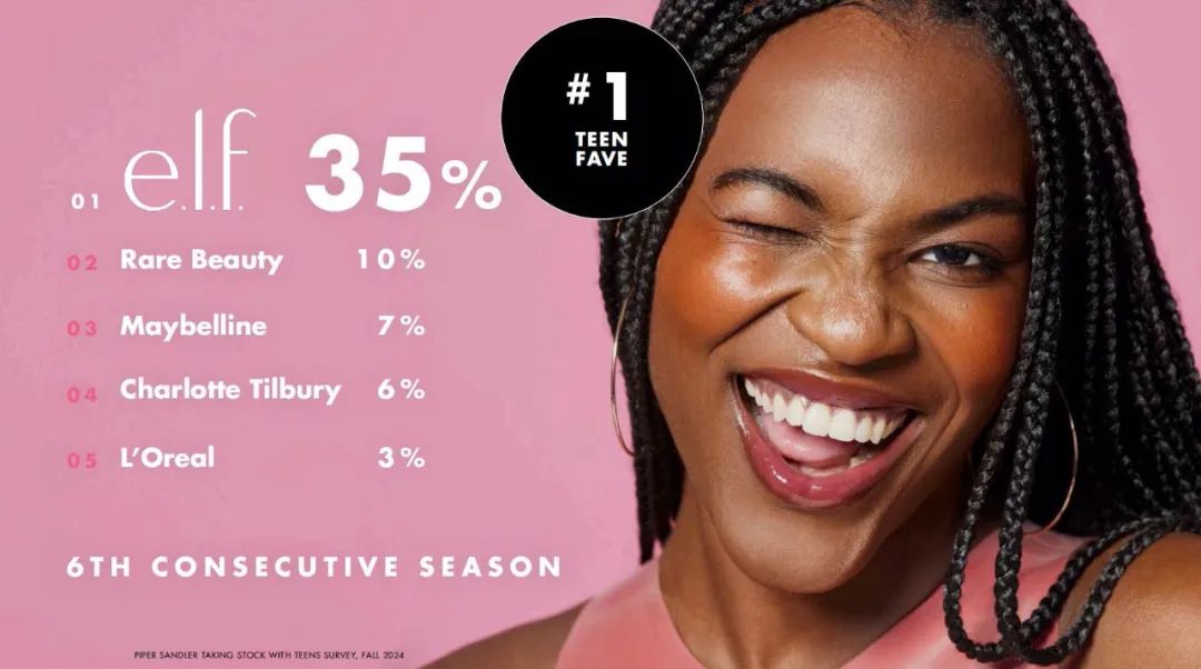 据elf Beauty披露的文件显示,在2024年秋季券商投资机构PIPER SANDLER对青少年的市场调查中,e.l.f.品牌的受欢迎程度为第一,超过了Rare Beauty、美宝莲、Charlotte Tilbury、欧莱雅等一众知名彩妆品牌。