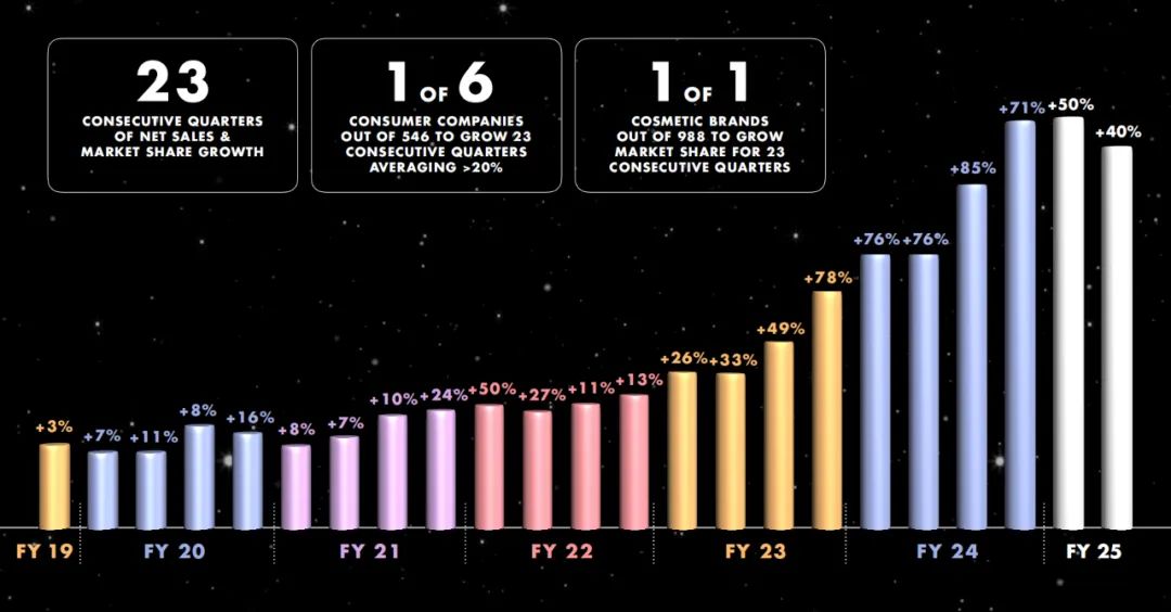 这,也是elf Beauty连续23个季度实现净销售额增长和市场份额增长。从elf Beauty披露的官方数据来看,自2021财年第三季度开始,elf Beauty就一直保持着两位数的高速增长。其中,2023财年第四季度至2024财年第四季度五个月内,甚至维持了70%以上的超速增长。
