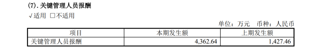 管理层的薪酬增长更为明显。2023年,公司关键管理人员报酬4362.64万元,较2022年的1427.46万元,同比增长2.05倍。