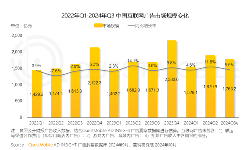 不过需要注意的是,微博广告及营销业务的营收增速落后于行业大盘。QuestMobile数据显示,2024年Q3,中国互联网广告市场规模为1763.2亿元,同比增长5.5%。