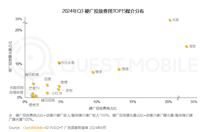 QuestMobile数据显示,2024年Q3,硬广投放费用TOP 15媒介榜单中,微博占比仅为5%左右,远低于抖音20%左右的占比。