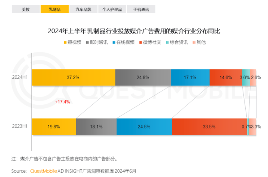 以乳制品行业为例,2024年上半年,该行业媒介广告费用投向微博的占比仅为14.6%,同比下降18.9个百分点;投向短视频平台的占比为37.2%,同比增长17.4个百分点。显而易见,短视频平台蚕食了微博广告业务的市场影响力。