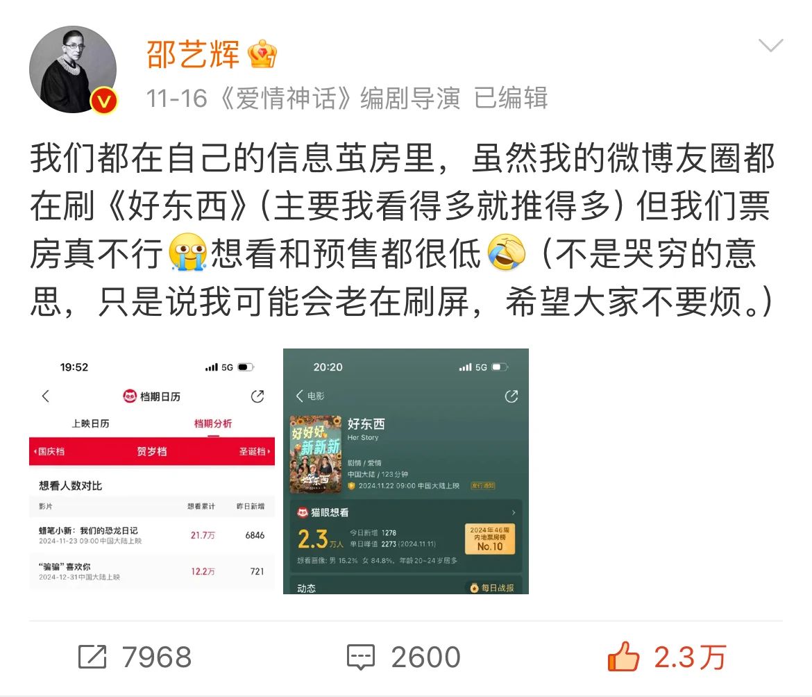 即便一轮点映后好评如潮,11月16日开始的二轮点映,范围扩大至一二线64城,但想看和预售数据仍旧没有太大起色,导演邵艺辉也发文求扩散。