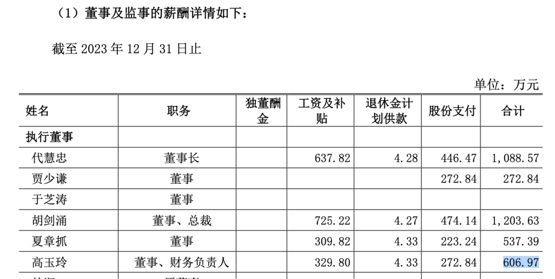 目前,高玉玲在海信家电通过员工持股平台持有公司0.04%的股份,2023年收到股份支付272.84万元,另外高玉玲2023年税前报酬334.13万元,因此2023年她的合计薪酬有606.97万元。在海信家电整个董监高的队伍中名列前茅。
