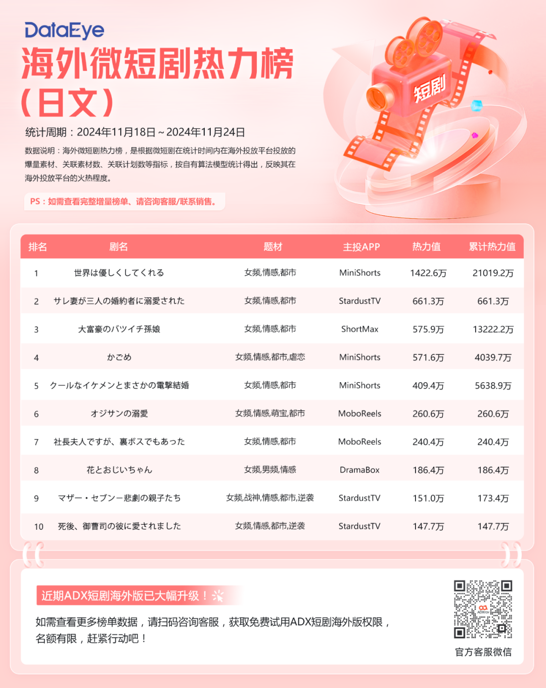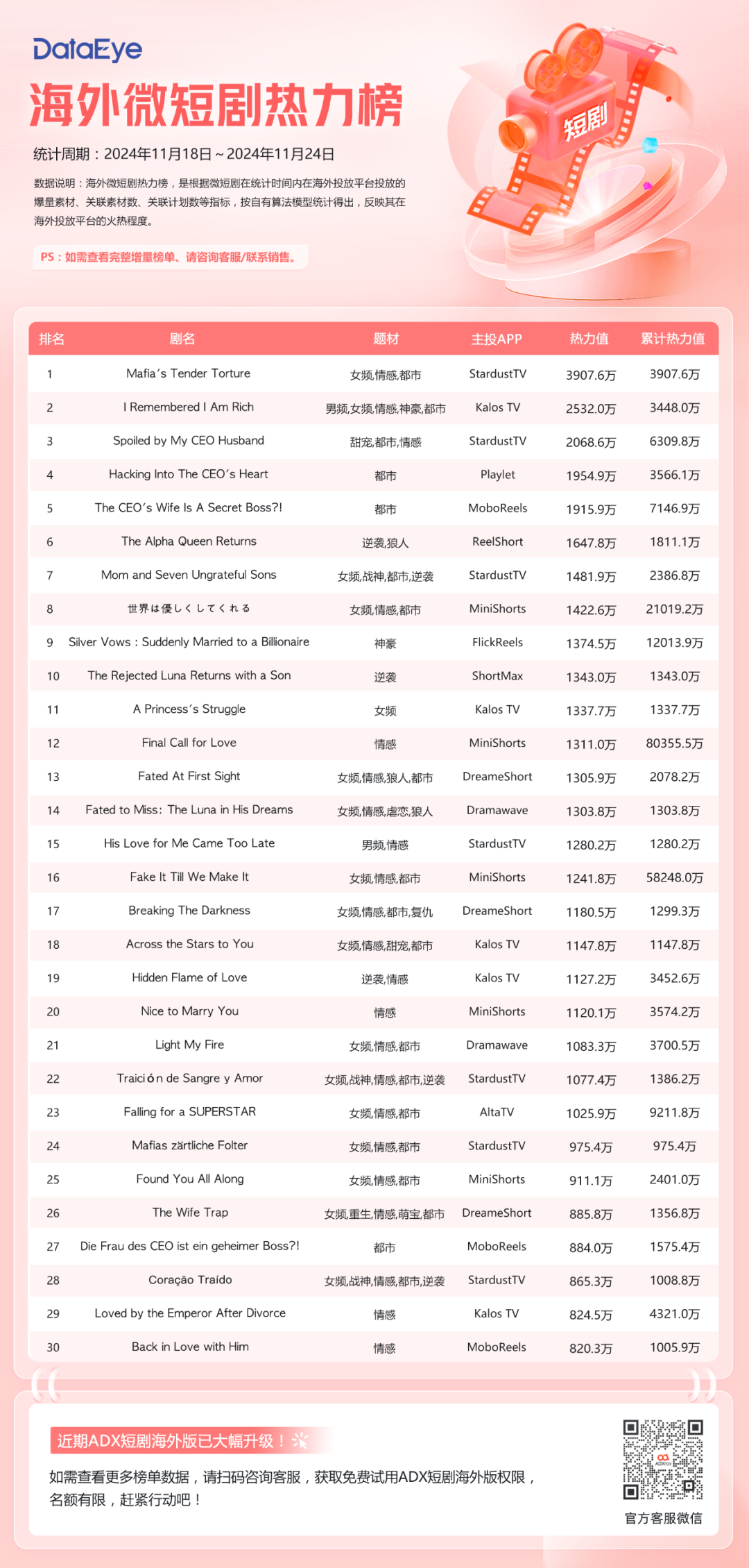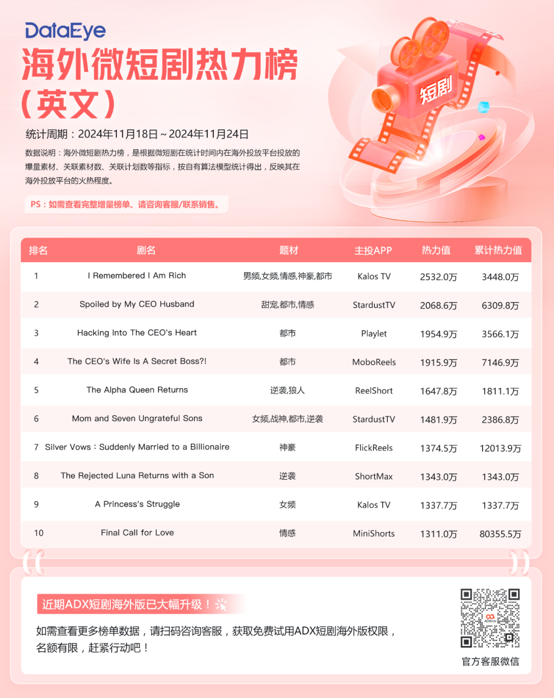 透过一周(11月18日-11月24日)海外数据,DataEye短剧观察发现了以下几个主要趋势和结论: