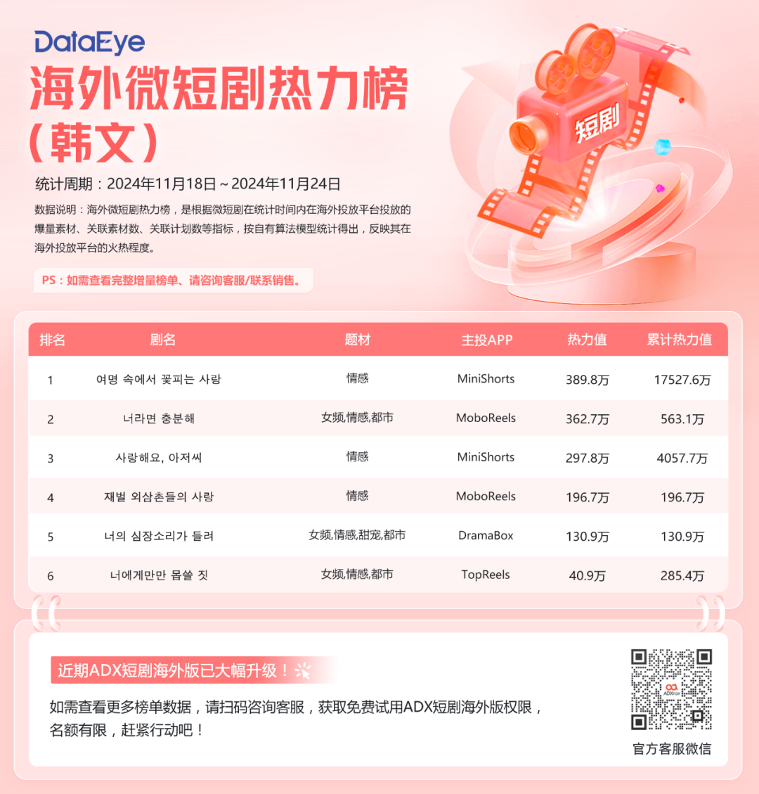 从热力值来看,本期DataEye海外韩文短剧热力榜中,TOP2热力值均超300W,5部短剧热力值超100W。