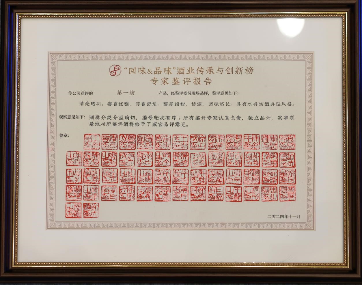 “清亮透明。窖香优雅,陈香舒适。醇厚绵甜,协调,回味悠长。具有水井坊酒典型风格。”“回味&品味”酒业传承与创新榜专家鉴评报告也给予水井坊“第一坊”高度评价。