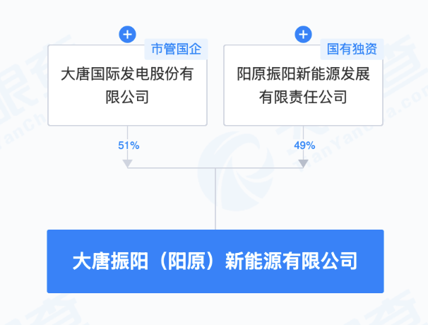 天眼查APP显示,近日,大唐振阳(阳原)新能源有限公司成立,法定代表人为谢生源,注册资本为1亿元,经营范围包含:发电业务、输电业务、供(配)电业务;太阳能发电技术服务;风力发电技术服务;电力行业高效节能技术研发等。天眼查股权穿透显示,该公司由大唐发电、阳原振阳新能源发展有限责任公司共同持股。