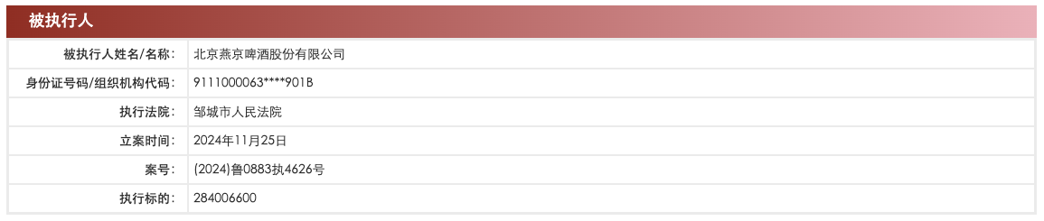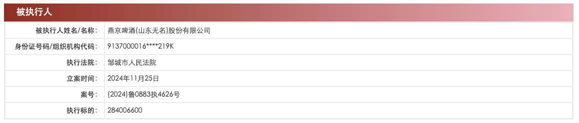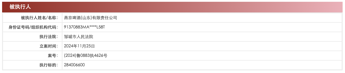 中国执行信息公开网显示,11月25日,北京燕京啤酒股份有限公司及旗下燕京啤酒(山东无名)股份有限公司、燕京啤酒(山东)有限责任公司新增1条被执行人信息,执行标的2.84亿余元,执行法院为邹城市人民法院。