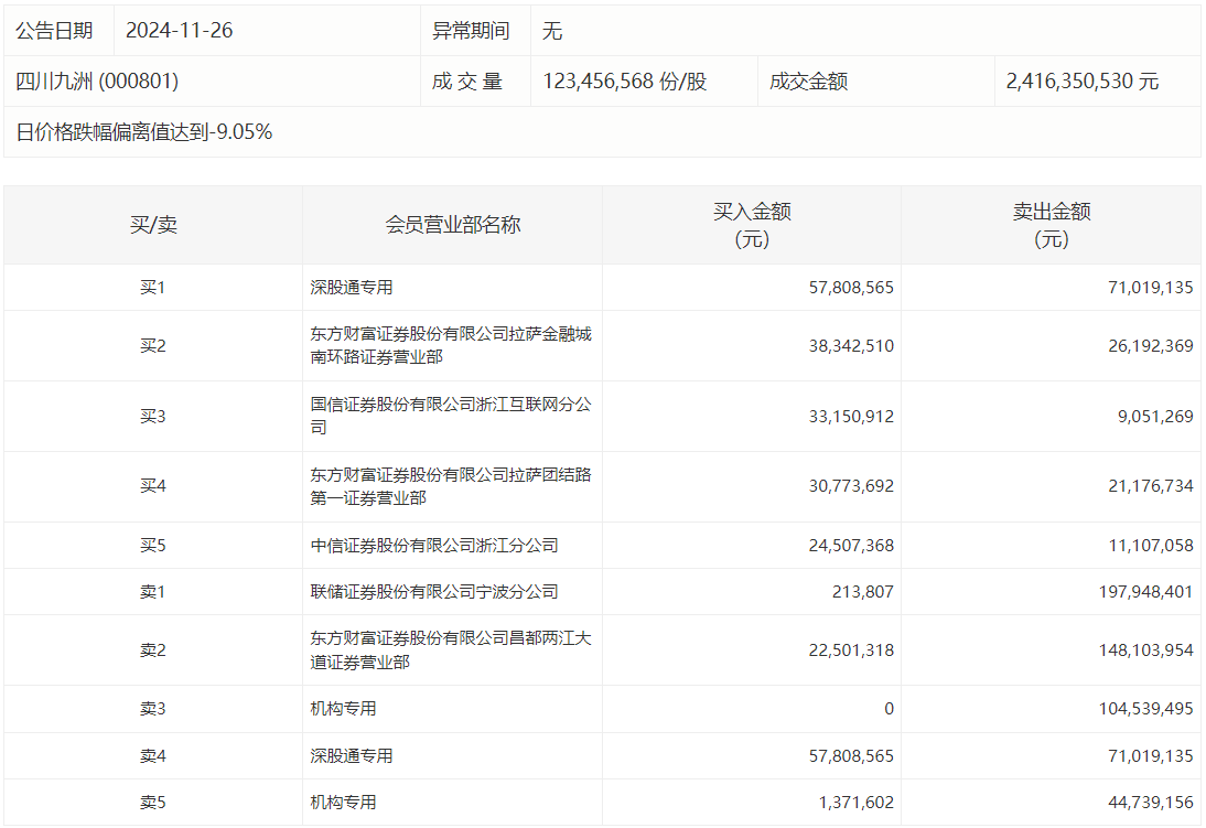 四川九洲今日跌停,成交额24.16亿元,换手率12.07%,盘后龙虎榜数据显示,深股通专用席位买入5780.86万元并卖出7101.91万元,二机构净卖出1.48亿元。