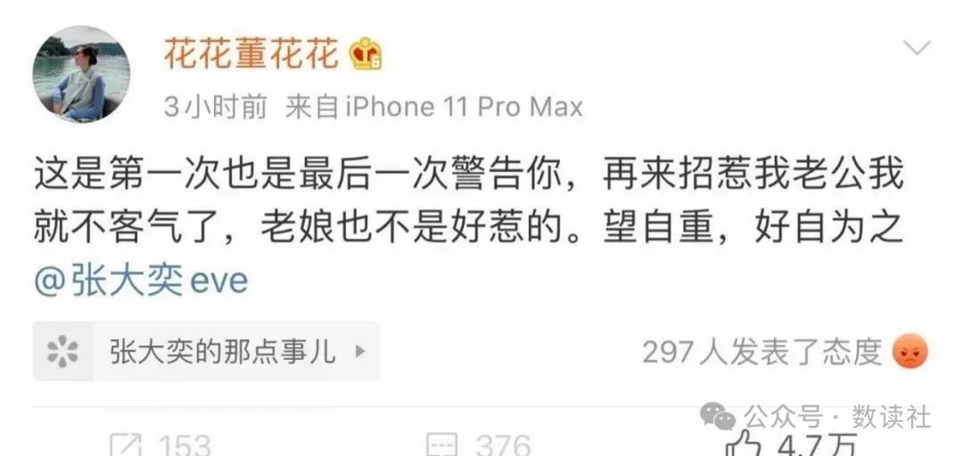 4月17日,微博名为“花花董花花”的微博账号隔空喊话网红张大奕,“这是我第一次也是最后一次警告你,再来招惹我老公我就不客气了,老娘也不是好惹的。”这位博主被证实为蒋凡夫人。