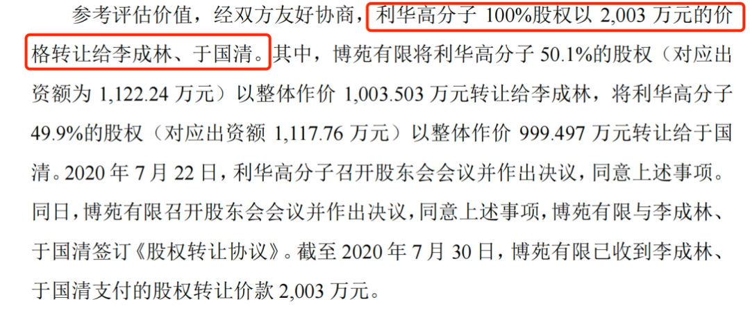 2020年7月,利华高分子100%股权以2003万元的价格转让给李成林和于国清,这一价格较两年前的收购价格2240万元已经缩水。其中,李成林出资1003.503万元,于国清出资999.497万元。